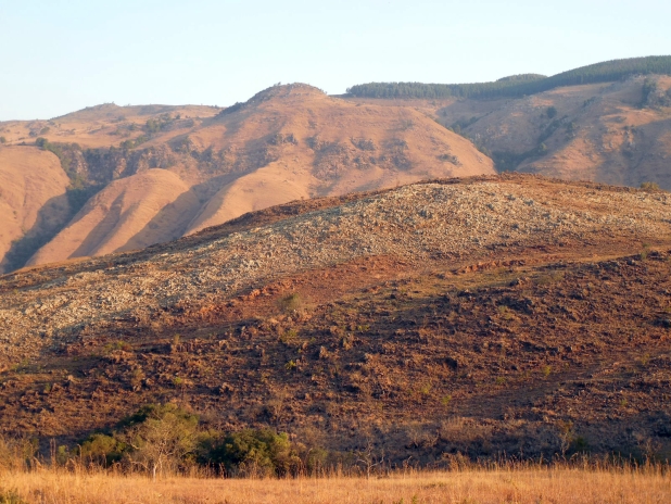 Field photograph showing part of the Pioneer Ultramafic Complex east of Barberton. The Moodies Hills, underlain by resistant quartz-rich Moodies sandstones, can be seen in the background. Light-colored strata consist of dunite, red strata in the foreground of pyroxenite.