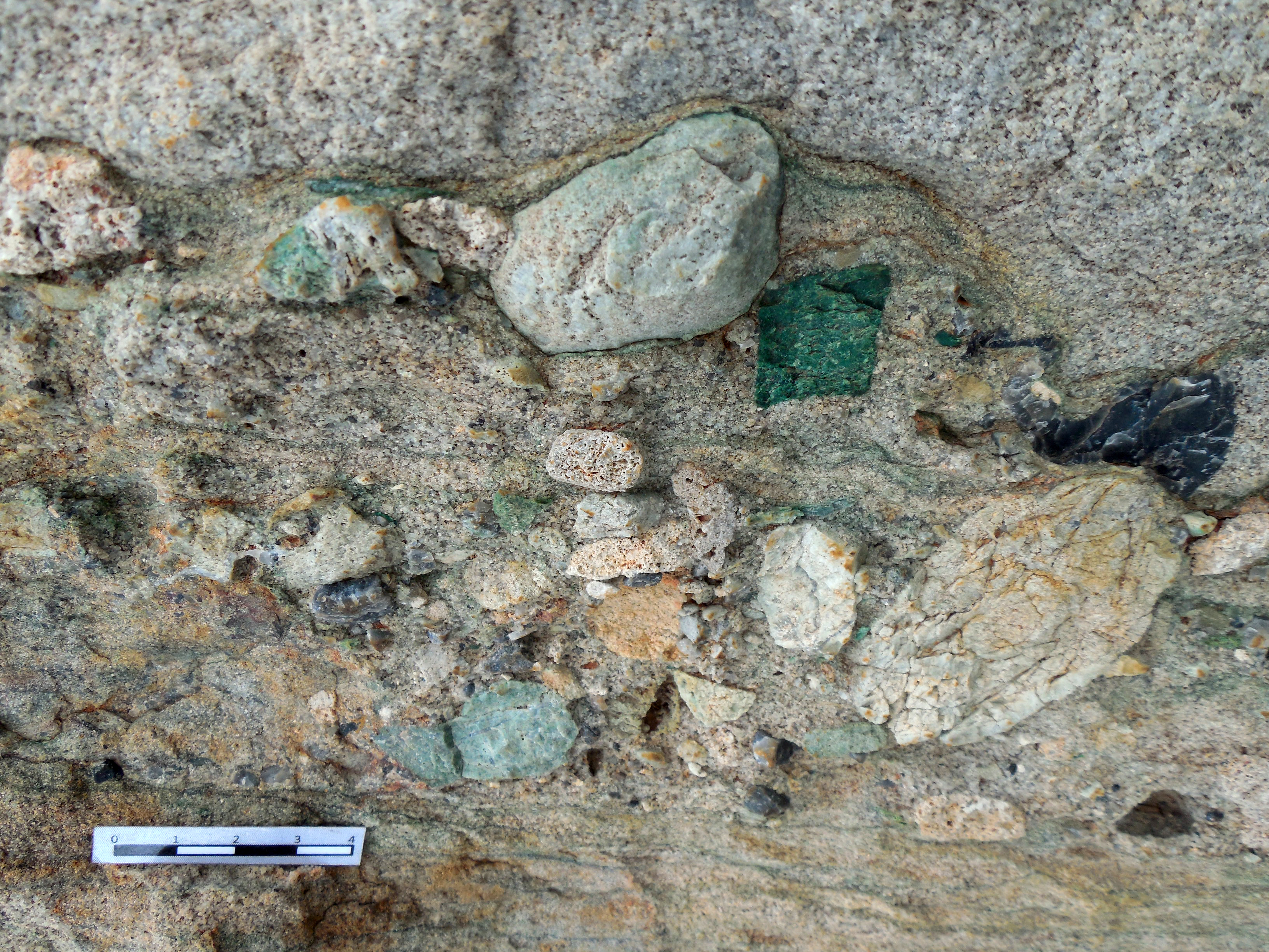 Microbial laminations interspersed with sandstone and overlying conglomerate of a fluvial-supratidal sandplain, exposed in the Moodies Group of the Saddleback Syncline, central Barberton Greenstone Belt. Angular green clast is composed of altered ultramafic rock.